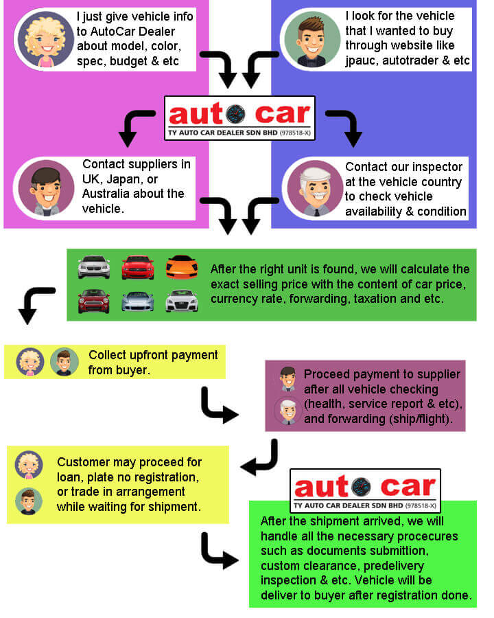 - After the vehicle arrived at Malaysia Port, we will bring the vehicle back to our showroom and handle all the custom clearance, import duty, AP arrangement, predelivery inspection and so on.